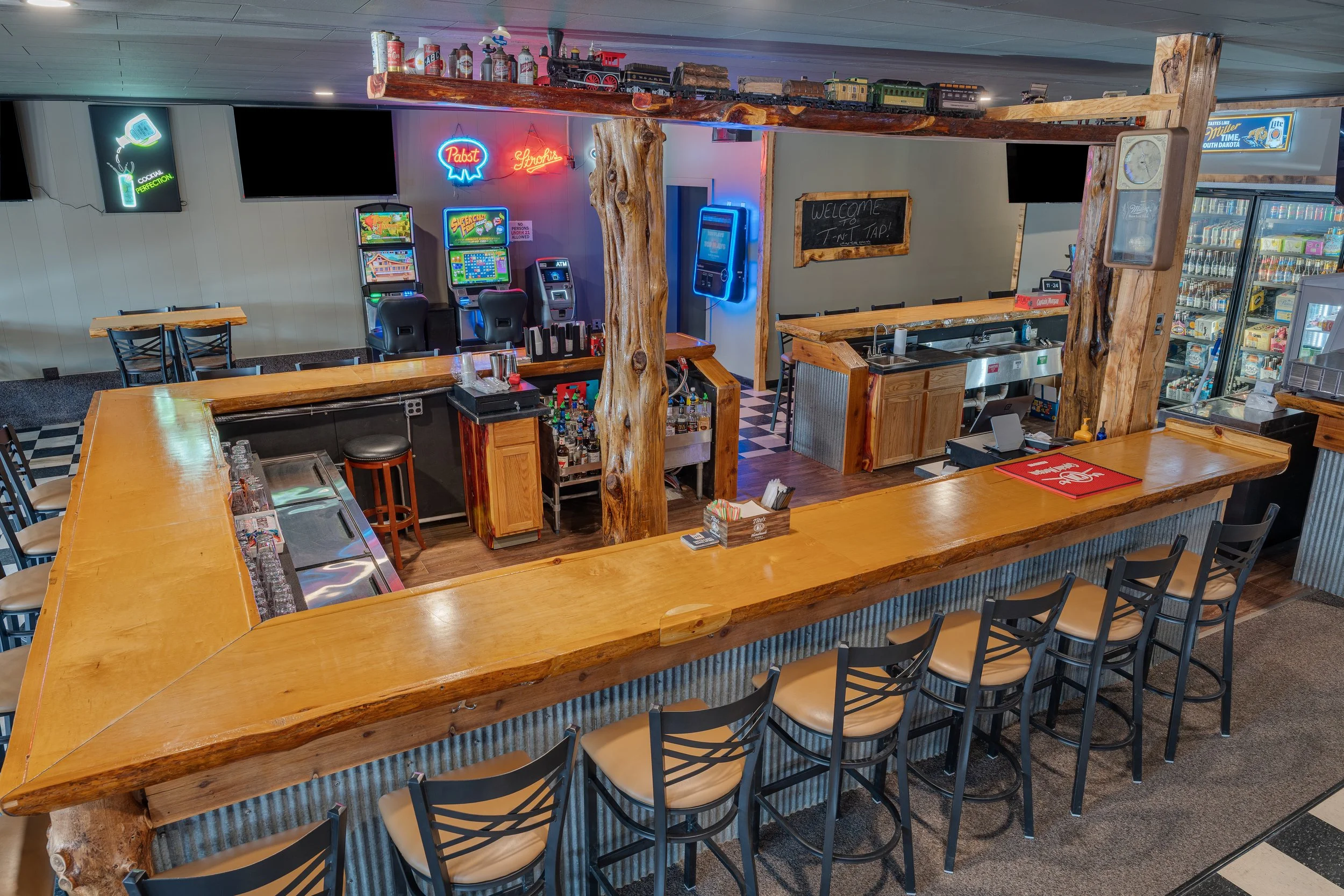 A two-story house with reddish-brown siding, black garage doors, and a front porch, surrounded by a green lawn, trees, and a clear blue sky with scattered clouds.