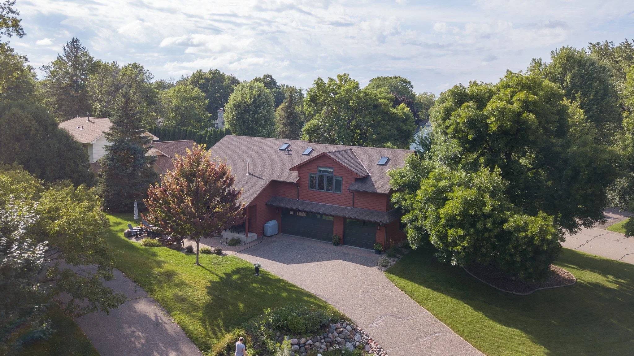 Aerial view of a residential house with attached garage, surrounded by tall trees and green lawn, under a partly cloudy sky.